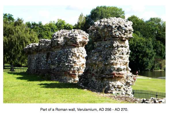 The major remaining segments of a mighty Roman wall indicate the significance of Verulamium. Parts of the structure are four metres high, and fascinating to compare with the abbey church, built 800 years later, in exactly the same materials of flint and brick. The church builders recognized what would ensure and assure their legacy!