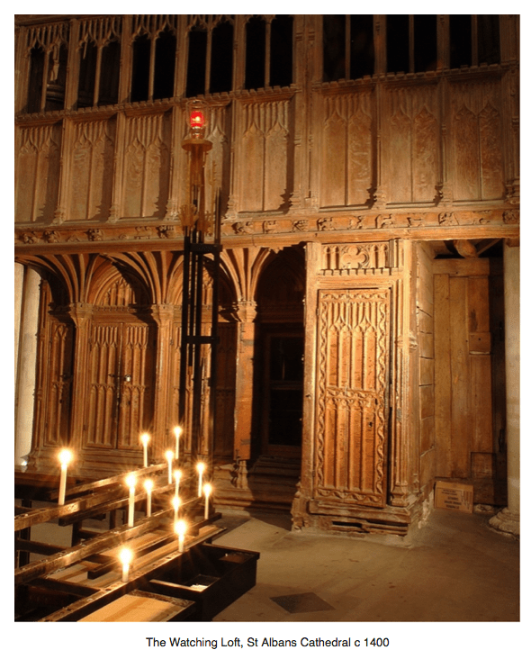 Where else can you see a stomping Norman nave – the longest in England – whose elephantine columns are offset by delicate, ghostly 13c figurative frescoes? Where else can you see a Lady Chapel still with its Edenic and undamaged profusion of 14c stone-carved floral capitals echoing a vision of a fragrant flower-bedecked heaven awaiting us? Where else can you come close to the presence of the 15c pilgrims visiting the saint’s shrine – each desperate for the spontaneous healing of painful ailments only the saint could provide? We can stand where the pilgrims would have gathered below a carved fan vaulted timber ‘watching loft’ adjacent to the shrine. There, stern monks stood guard – as if Yeomen of the King’s Guard – from first floor window openings. From high above the shrine floor, they scrutinised the crowd below easily spotting an unruly pilgrim or two, and order their immediate removal.