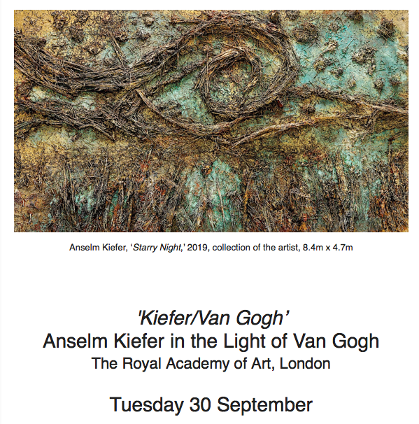 This endlessly fascinating show sets the work of the greatest living artist, Anselm Kiefer (1945 – ), in the context of the work of the greatest artist of the 19c, Vincent Van Gogh (1853-1890). Kiefer has never shied away from acknowledging Van Gogh’s seminal and long lasting influence on his work , not just the Dutch painter’s handling of paint, but the ‘confident construction’ of his paintings, the ‘rational structure’. Both approach three-dimensionality in their use of materials. With Van Gogh, it is oil paint layered upon layer. With Kiefer, other materials are added to the painted surfaces: straw, flowers, wire, lead, ash, clay, shellac, wood, and sand, etc. Each material can be understood symbolically as well as materially. The result is an art that is felt acutely by the spectator, in the very pit of their being, as is the case with Van Gogh. Both share an aesthetic in which there is an acceptance of the mystery that lies at the centre of true works of art. Van Gogh, Kiefer has said, ‘re-invests landscape with its secret’. The comparisons between the two are endlessly rewarding.