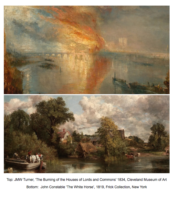 Turner and Constable, born 250 years ago, first met at a Royal Academy dinner in 1813, after which Constable commented on Turner’s ‘wondrous range of mind’; he presumably found him stimulating company. Subsequently, during varnishing day at the annual Royal Academy exhibition, Turner, worried that Constable was going to outshine him, placed a red blob of paint on his picture to ensure only his would be noticed. Perhaps Constable was less impressed at that point; certainly they had little enough in common. Turner was the barber’s son from Covent Garden, Constable the son of a wealthy East Anglian owner of land, windmills and barges on the river Stour. Turner travelled widely in Britain, France, the Alps and Italy and used his resulting sketches to compose mighty history paintings. Constable famously found most (though not all) of his subjects in ‘400 yards of Suffolk scenery’ as his biographer Leslie put it. Turner was interested in broad effects of sunset atmosphere, Constable in the specific highlight on an individual wet log. Each has a different tale to tell of the world in which they lived.