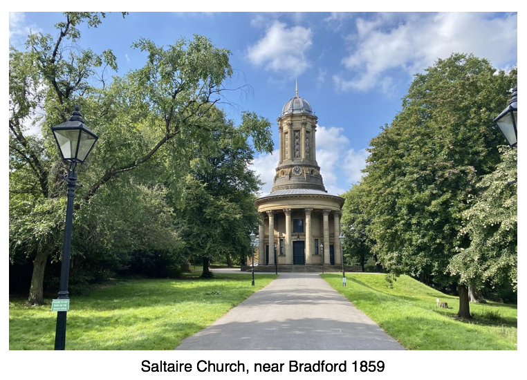 Bedford Park, 150 years’ young this year, is of course the first garden suburb, a utopian community dependent on railway transport into the nearby city, and planned like a fan with the handle, the fulcrum perhaps, as Turnham Green Station. But the UK is rich in other model developments, not just in garden suburbs such as Hampstead or Letchworth, but also particularly in the ideal, often countrified, village attached to a factory. Bournville near Birmingham was established by the Cadbury family to house workers at its chocolate factory, as was New Earswick outside York, founded by the Rowntrees; Port Sunlight on the Wirral was built to house workers at the eponymous soapworks, and Saltaire, outside Bradford, equally eponymous and the earliest of these, was founded by Titus Salt in 1851, to house his cloth workers away from the noisome slums of Bradford, just as George Gilbert Scott’s Akroyden in Calderdale, founded by the remarkable benefactor Colonel Akroyd in 1855, housed his workers in the countryside away from his works in Halifax.