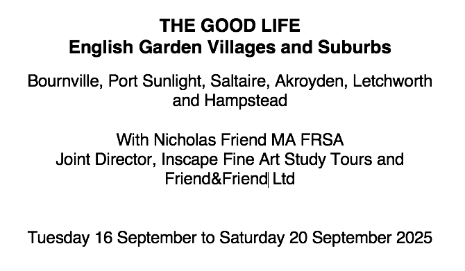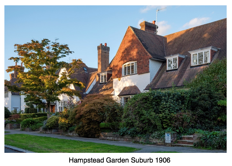 On our way back to Turnham Green we visit Letchworth, proudly declaring itself to all arriving at its station as First Garden CITY (we ask ourselves why a city?), home of the first roundabout, quite extensive front gardens, and a temperance pub. We end with Hampstead Garden Suburb, brainchild of Henrietta Barnett and her husband Samuel Barnett, who had been responsible for Whitechapel Art Gallery and Toynbee Hall in the East End. Like Letchworth, the principal architects of Hampstead were Barry Parker and Sir Raymond Unwin, both notably influenced by Bedford Park. It will be fascinating to see what they took from their forerunner the pioneer, and what they chose either to enhance or to leave out.