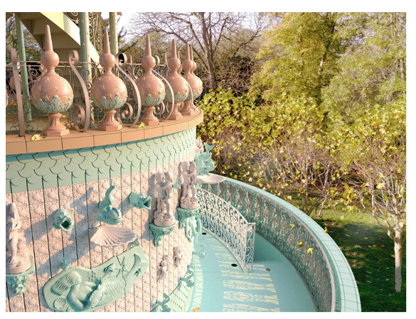 An absolutely astonishing ceramic ‘wedding cake’ in soft pastel shades of pink, green and blue, studded with gargoyles, seashells and mermaids, the Wedding Cake is a gorgeous folly into which we are invited, and, may, if we wish, climb to the very top to look out over the verdant grounds of the Rothschilds’ French Renaissance Waddesdon Manor.