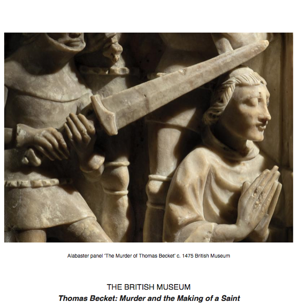 Marking the 850th anniversary of one of the most powerful figures of his times, this special exhibition at the British Museum presents Becket’s tumultuous journey from a merchant’s son to an archbishop, and from a revered saint in death to a “traitor” in the eyes of Henry Vlll more than 350 years later. The archbishop’s slaying and martyrdom transfixed the medieval world – and inspired some magnificently murderous art and artefacts that are still shocking today. The aim of the exhibit seems to be to get up close to the man, the murder and the legend through an array of objects associated with Becket such as illuminated manuscripts, some of which contain eye-witness accounts of the murder, jewellery and sacred reliquaries. Its centrepiece is a stained-glass window from Canterbury Cathedral, on loan for the first time, portraying the scene of the priest’s brutal murder by four knights loyal to King Henry II in 1170. The 6-metre-high window, originally one of 12 ‘miracle’ windows created in the early 1200s, has never before left the cathedral nor been seen at eye level by the public. Some objects are rare loans from institutions across the UK and Europe and are being brought together for the first time.