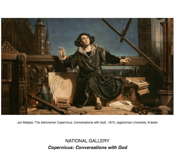 Never before has a painting by a Polish painter- let alone one by the national painter of Poland- been exhibited in the National Gallery! This splendid painting by Jan Matejko is of Copernicus, the Polish genius who changed the world by demonstrating that the earth rotates around the sun rather than the other way about. Our understanding of our place in the universe was changed by Copernicus. Never thereafter did intelligent human beings gaze into the night sky in quite the same way. Prior to that, Ptolemy’s theory (proposed in his Almagest c. 150 CE) that the Earth was the stationary centre of the universe, underpinned the entirety of the medieval Judeo-Christian world view. In Ptolemy’s view the human inhabitants of the earth were seen as favoured by God who had placed humankind at the centre of a fixed and finite universe. The notion that the earth might move, and the universe be almost infinite, was seen as little short of blasphemous. We study this remarkable painting in the context of other portraits of Copernicus, and look at his extraordinary influence on Galileo, Newton, modern astronomy, and beyond into 21c technology.