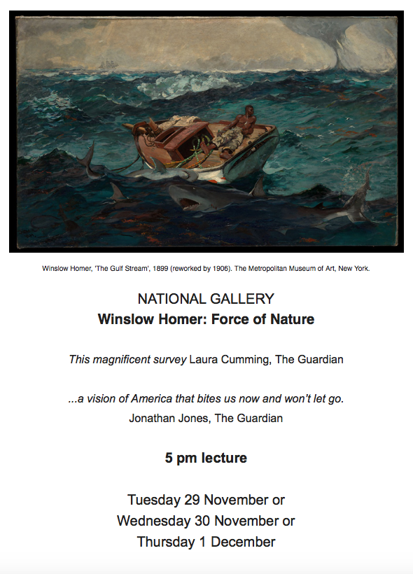 In this current exhibition we see less familiar sides of Winslow Homer (whose work is anyway rarely seen on these shores), particularly his profound responses to the horrors of the American Civil War, as well as his magnificent and often overwhelming seas, their heroes and heroines, victims and survivors. The Lucian Freud exhibition offers an entire lifetime of his artwork from the strikingly linear, almost primitivist and often startlingly fresh early work through to the late titanic flesh-paintings and self-portraits inviting comparison with Titian and Rembrandt. A small but exquisite exhibition of two magnificent paintings by Turner, on special loan from the extraordinary Frick Collection in New York, focus our attention on the ramifications of his extraordinary “tour” paintings with their familiar landmarks dramatically dissolved into reflections on water. On these working journeys, often undertaken in the acute discomfort of poorly-sprung coaches on rough, storm-tossed roads, he managed to create most of his oeuvre of at least 30,000 works on paper, of which 2000 were finished watercolours to stand alongside 500 oil paintings. These journey pictures take us way beyond a theme of picturesque tourism into whole worlds of meditation on history and geography, as well as the art and science of weather in its effects on light and atmosphere. We use these two magnificent paintings as springboards for exploring the depth and breadth of Turner’s resolute and inventive mind as he painted and sketched under the most dire conditions.