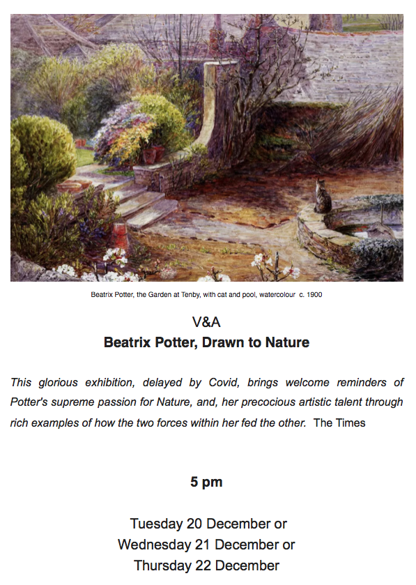 The V&A permits us to value Beatrix Potter even more at this particular moment as she inspires us to go beyond our fond childhood memories of Peter Rabbit. We see her uncanny understanding of animals in the minute details she observed and so realistically captured. The exhibition provides an opportunity for us to explore anew and in detail, not only their jaunty realism, but their context in the gorgeous landscape of her home at Sawrey in the Lake District, As children, we may have been too taken up with the wonder and awe of the subjects of her originality to notice the remarkable and beautiful accuracy of her depictions of plants as well as animals. What added pleasure her art and fine perceptions afford us, now more than ever!