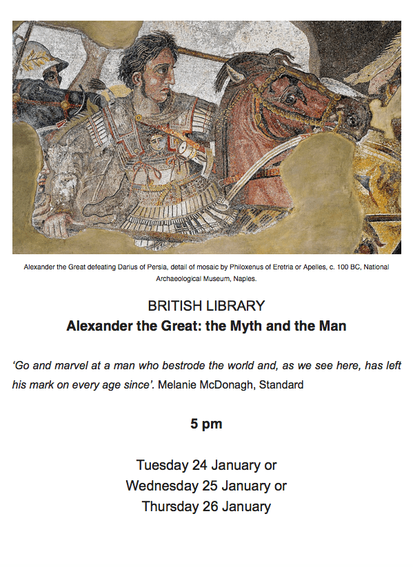 The British Library exhibition on Alexander the Great illustrates the vast array of myths surrounding, even obscuring, the legacy and accomplishments of Alexander the Great (356–323 B.C.). Some of the myths he manufactured himself (he thought he was descended from the gods and as such could repel the waves), some by later picture makers, showing that he battled winged foxes, descended to the underworld, invented the first diving bell, and went into battle in a flying chariot. The reality is as interesting, even astonishing, and forms the basis of our exploration in this study. Alexander was a cultured man, a pupil of Aristotle, familiar with mathematics, philosophy, art, theatre and literature. Yet rather than languish in conversation or contemplation, he led 50,000 men for ten years, many twice his age, on an expedition on foot and elephant of more than 11,000 miles. At the conclusion of this unimaginable journey he was King of the Greeks, Pharaoh of Egypt, ruler of Persia! His empire stretched from Greece to Northwest India. Founding more than 20 cities that bear his name, he precipitated immense social and political change throughout the Mediterranean and Near Eastern worlds. It is small wonder that myth outstrips the mundane in his case!