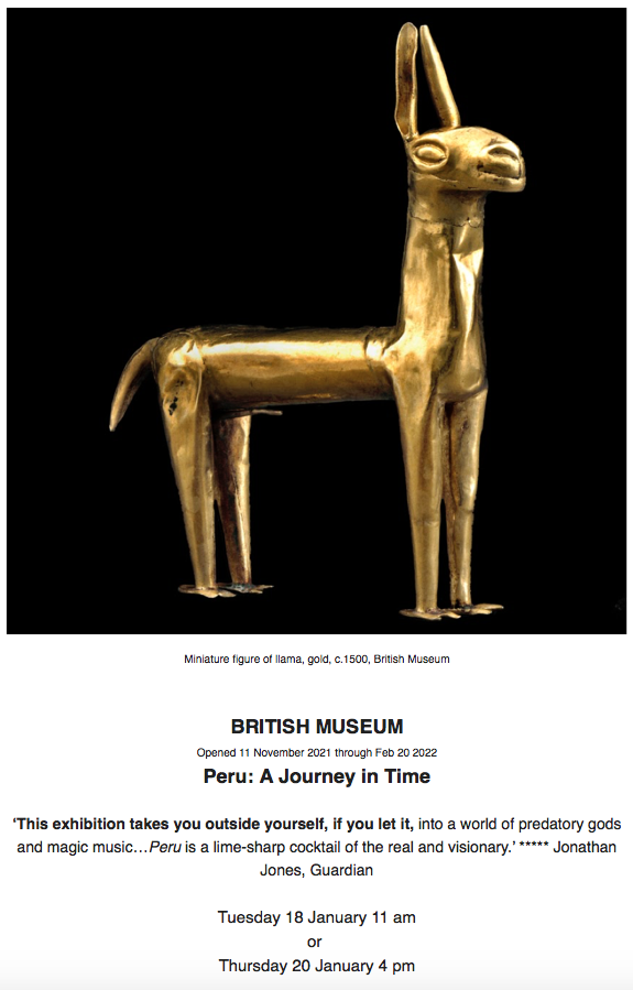 ‘Peru: A Journey in Time’ at the British Museum transports us to one of the most ancient civilisations in the world – stretching back to the tenth millennium BC – only to be invaded and conquered by the Europeans in the 16c, and their culture all but destroyed. The exhibition features extraordinary objects from the BM’s vast collection, including pottery, gold, silver and other precious metals, complex textiles, and ritual paraphernalia as well as remarkable pieces borrowed from public and private collections in Peru itself. An appreciation of the artistic accommodations and prowess of ancient Andean cultures illumines this major show.