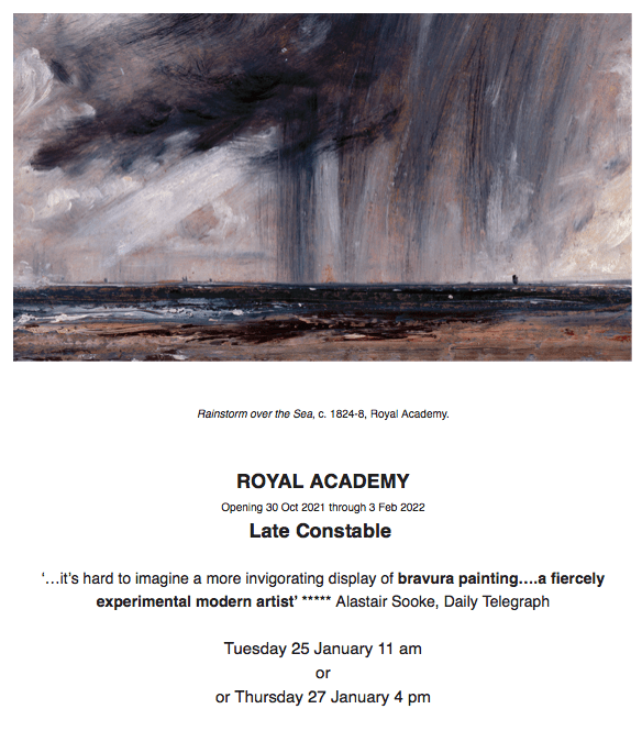 A bit later, yet another career was built on a rebuttal when Constable deliberately chose various shades of green for his palette to counter the Royal Academy premise that the foreground of landscapes should be ‘brown, …”as brown as an old Cremona fiddle’. This exhibition at Royal Academy seeks to once and for all dispense with the idea that Constable should be seen as a rather dull establishment figure by instead focussing on his brilliant, highly emotional and expressionistic late period.