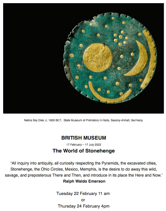 The World of Stonehenge, also at the BM, brings welcome clarity to the rather speculative ‘story’ of Stonehenge that has been possible until now. This first major exhibition of its kind in the UK seeks to reveal that the Britain and Ireland of 4000 years ago were places of transformative activity complete with big ideas, vital commerce, and travel. Stunning recent archaeological and scientific discoveries have revealed Stonehenge to be but part of a mighty Bronze Age scheme of erecting astonishing monuments in various locations. This special exhibition adds more than interesting questions about matters we have been endeavoring to understand about its purpose, cultural power and the people who created it.