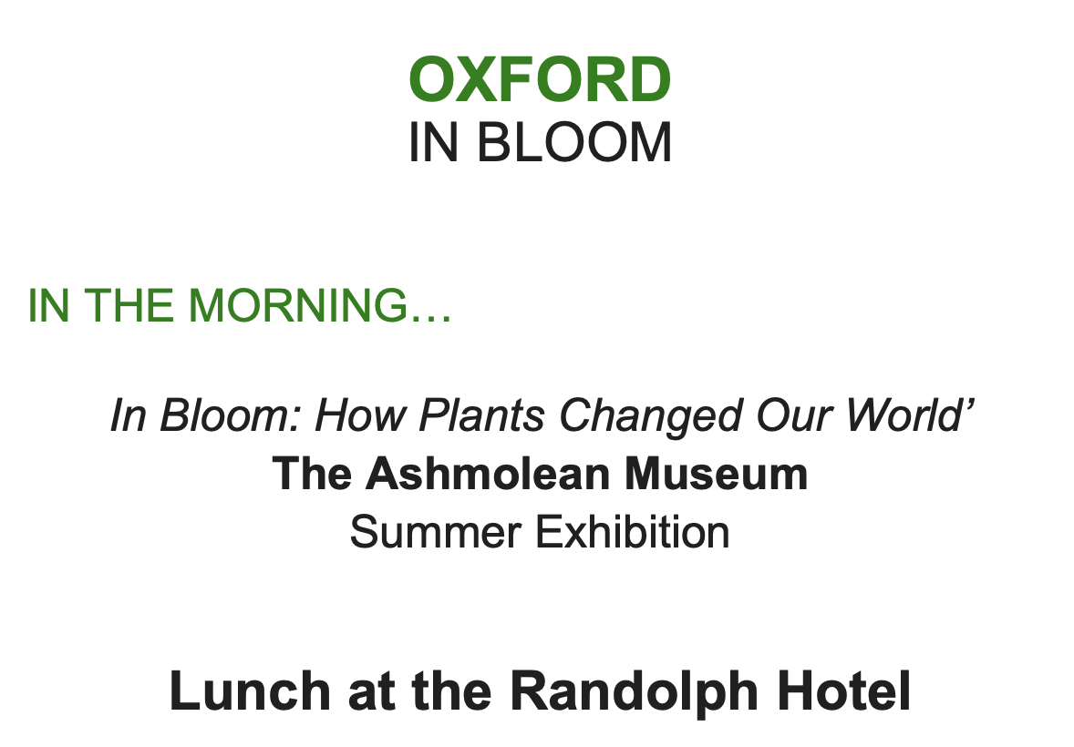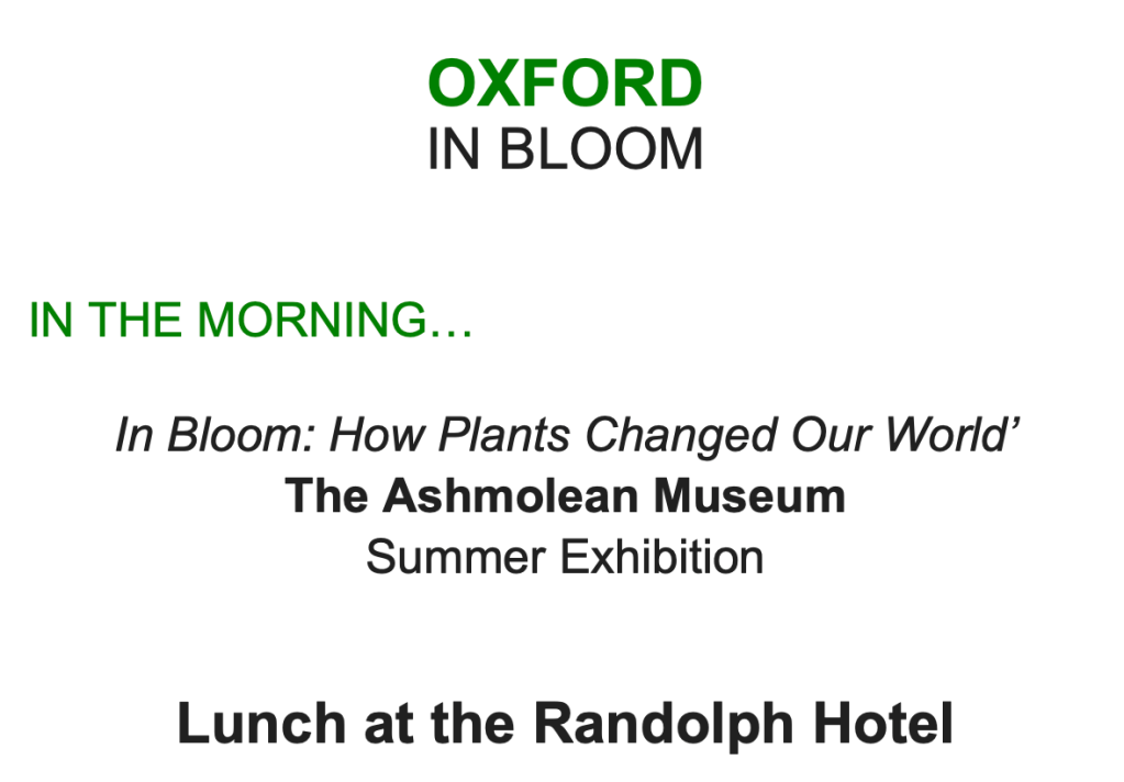 This study day ‘Oxford in Bloom’ has been developed by Louise Friend and will be presented by Nicholas Friend. Cheques are not a viable option at this time. Instead, please make your payment to Friend&Friend Ltd by bank transfer to our account with Metrobank, bank sort code 23-05-80, account number 13291721 or via PayPal to nicholas@inscapetours.co.uk, or credit/debit card by phone to Henrietta on 07940 719 397. She is available Tuesdays 2-5 pm or Thursdays 2-5 pm.