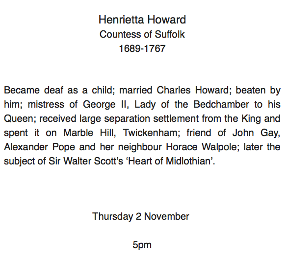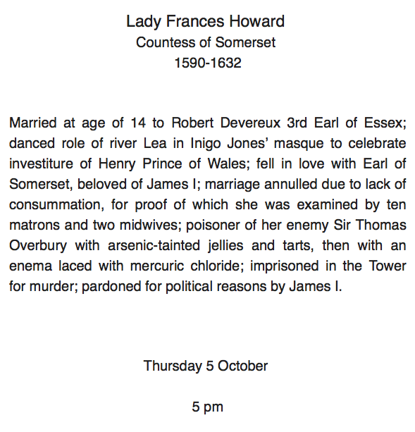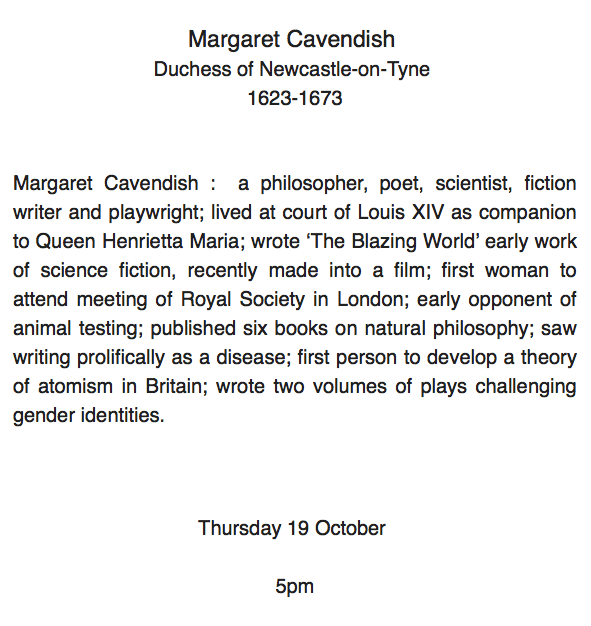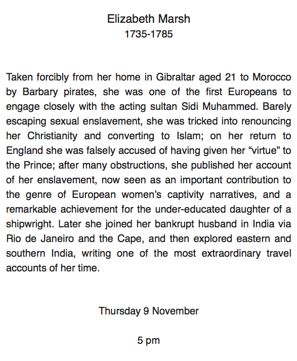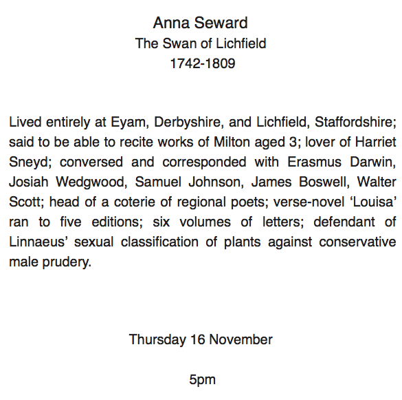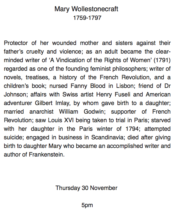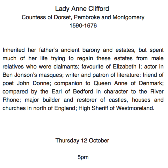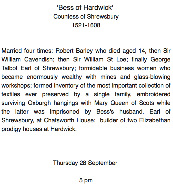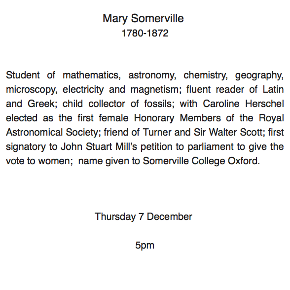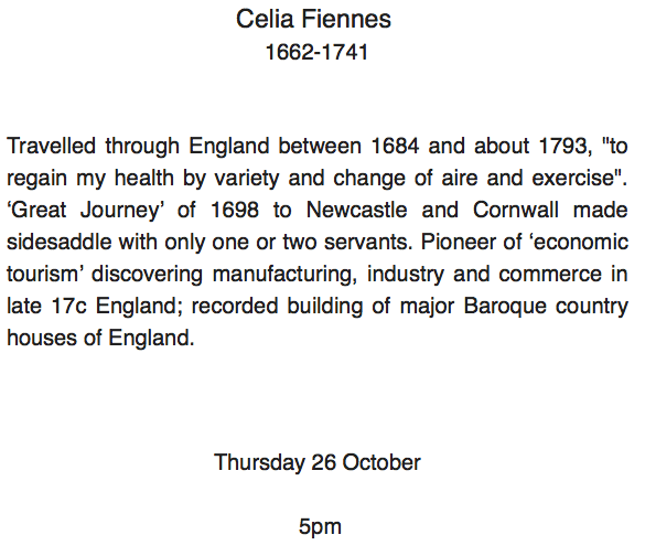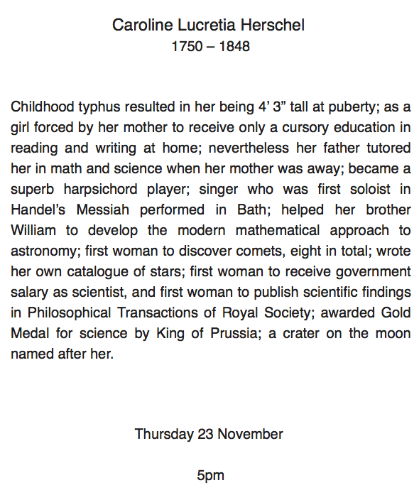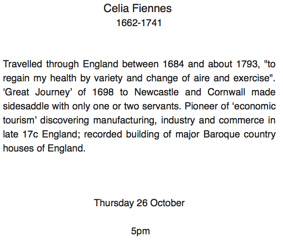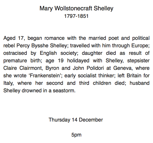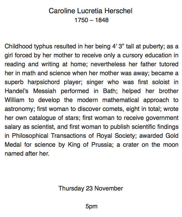 Bess of Hardwick, builder of not one but two versions of Hardwick Hall in Derbyshire; Lady Frances Howard, a dancer and poisoner; Lady Anne Clifford, repairer of castles and claimant in the courts for her family’s estates; Margaret Cavendish, writer of science fiction utopia ‘The Blazing World’; Celia Fiennes, unaccompanied explorer on horseback, and writer of a journal ‘To Newcastle and Cornwall; Henrietta Howard, mistress to George II while being best friends with his wife; Elizabeth Marsh, a victim of Barbary pirates and patriarchal assumptions; Anna Seward, renowned poet and defender of the sexuality of plants; Caroline Herschel, discoverer of comets; Mary Wollstonecraft, leading feminist and supporter of the French Revolution; Mary Somerville, avid student of mathematics, astronomy, chemistry, geography, microscopy, electricity and magnetism; Mary Shelley, the writer of ‘Frankenstein: or The Modern Prometheus’.
