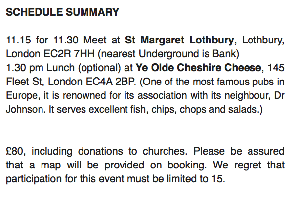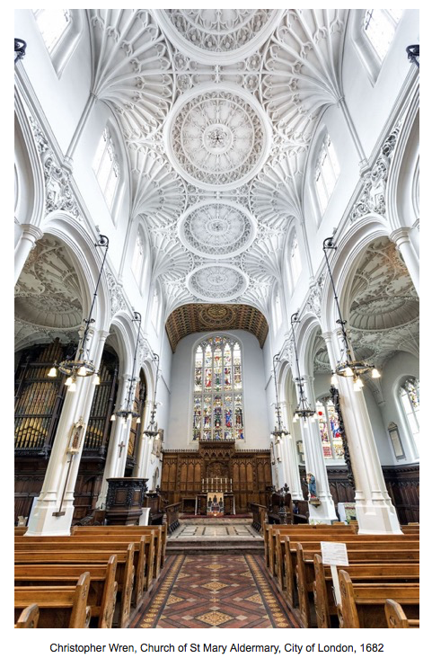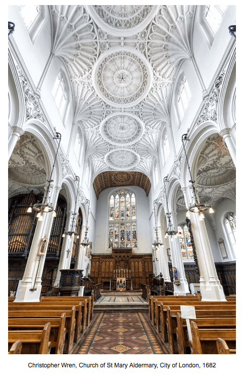 We begin with the great city church of St Margaret Lothbury, official church of no fewer than five livery companies, replete with numerous original 17c furnishings, including a reredos by Grinling Gibbons. By total contrast, St Mary Aldermary is a Gothic revival oddity among Wren churches, reminding us of the 1350’s cloisters of Gloucester Cathedral, or the early 16c fan vault of Kings College Chapel, Cambridge. We end with St Martin Ludgate, a jewel among Wren’s churches; he ingeniously squeezed an irregular oblong into a centrally-planned and beautifully-formed space, with magnificent carvings of the 1680’s. We discuss how Wren related this little gem to the mighty St Paul’s which towers over it from the top of Ludgate Hill.