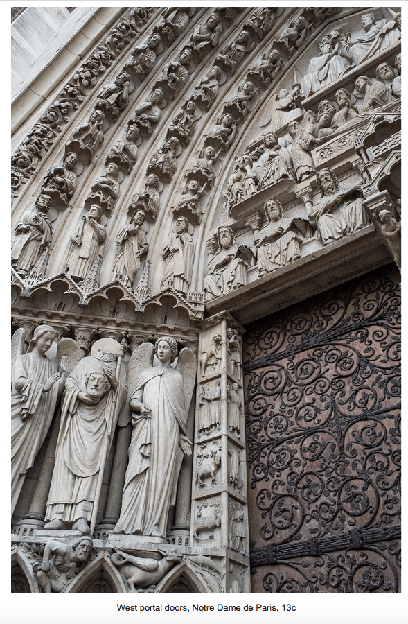 Doors to Gothic Cathedrals were symbolic of the passage to new life through the Mass. Such rites of passage were depicted as rich figurative sculpture, carved from softer limestone than that used for the main structure of the building. Whole programmes of sculpture were meticulously designed to warn you of the dangers of the world and of the rewards that awaited the faithful in heaven. At the same time, such sculptural programmes could answer to the needs of secular patrons, with extensive groups of Old Testament Kings reflecting favourably on the modern, earthly kings who had given rise to their sculptured effigies. Gazing down at us as we enter, their effect can move the most atheist of souls. On the wooden doors themselves foliate ironwork hinges hold together the planks of the doors, with leaves so lifelike and infused with energy you are persuaded to reconsider the skills of the blacksmith and see them as those of an artist.