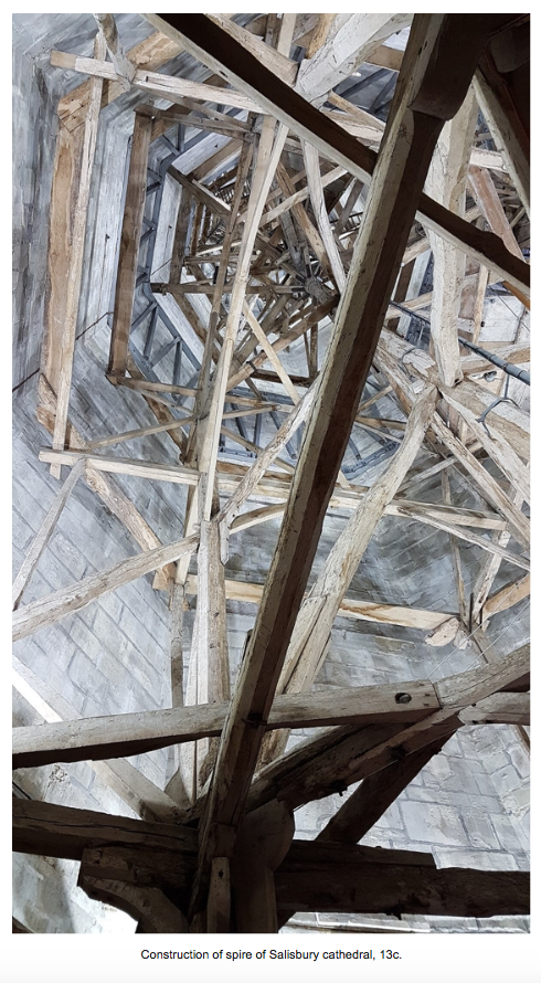 Gothic Cathedrals are masterpieces of illusionism. Looking up from the interior, you think you are looking at the underside of the roof supported on slender columns of the arcades and ribs of the stone vaults. Not so. The vaults do not support the roof, which is an entirely discrete entity, raised often high above the vaults and built before them. The structure of the timber supports may be of staggering complexity, as carpenters provide for stresses from the lead sheet cladding of the roof. The massive weight not only presses downwards, but because rooves tend to be angled, it presses the roof outwards. Tiebeams will be fitted to prevent this splay, which then pull the roof together but also push it upwards, necessitating tying the roof down as well.