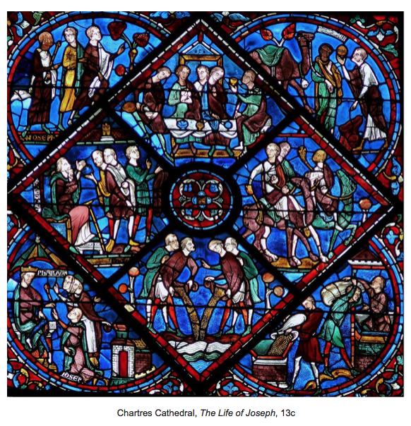 Central to the creative ambitions of the self-proclaimed inventor of Gothic architecture, Abbot Suger of St Denis, was the need to increase quantities of light in the building in order to symbolise the light of Jesus. The solution lay in the Gothic style of pointed arches that removed the need for heavy walls supporting the rooves, which instead could be supported on slender colonettes. Between those, vast areas of glass could be supplied, stained and painted with dazzlingly vivid imagery designed with complex programmes of narratives and iconography. Patterns of leading lines contributed to the beauty of the effect. Constructional skills were vital even here, for the elaborate foliate tracery of such windows needed to support any wall areas above them: these windows were often works of staggering engineering skill in order to produce an hallucinatory effect.