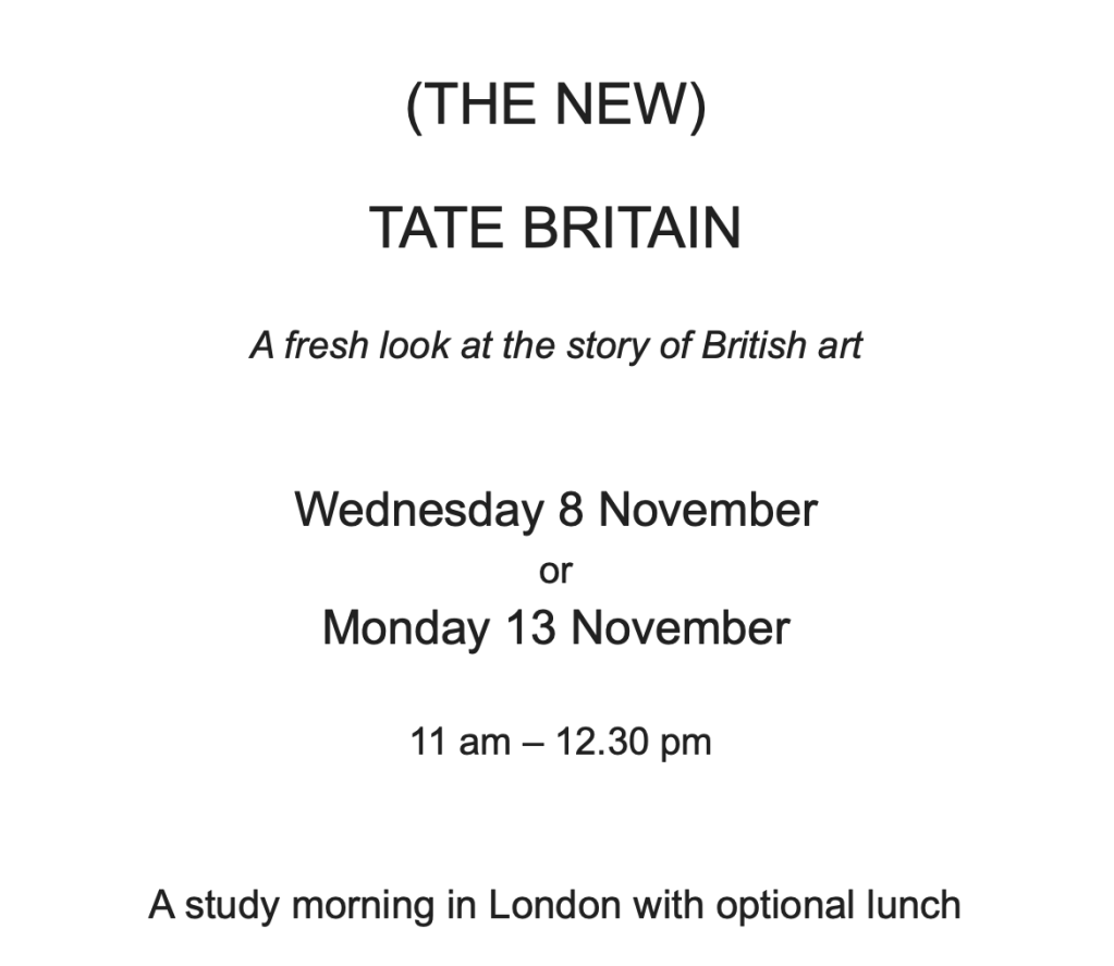 Please meet Nicholas inside the MANTON entrance of Tate Britain on one of two dates : 10.45 a.m. Wednesday 8 November, or Monday 13 November. We regret that numbers must be limited to 14 each day. Please let us know if you are able to join us for lunch. We expect the cost to be around £30 a head.