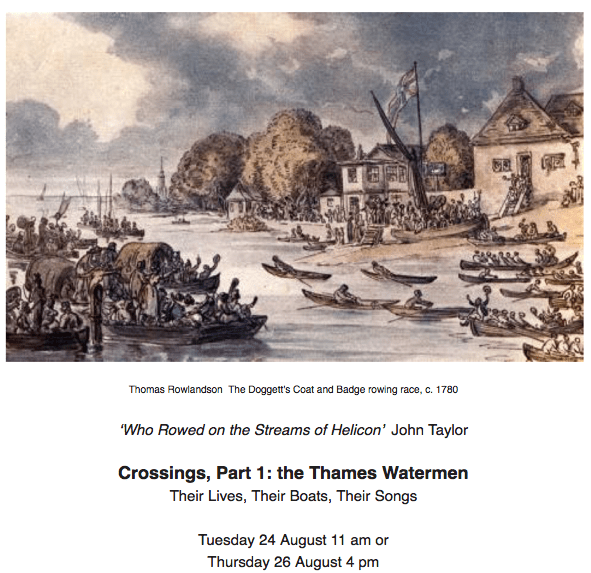 All society has braved the quick tides and currents of the Thames: delicate aristocrats, prominent politicians and watermen, pleasure oarswomen and criminals, hopeful anglers and scold-duckers, bathers and energetic rowing teams, weary Roman soldiers and beribboned wanderers, giddy school children and salty seamen, all have known the thrill of the Thames voyage replete with its peculiar murky odor, and silvery shimmering reflections. We will take our equally intrepid Inscape Zoom ‘journey’ down England’s Great River – from the source to the sea, from prehistoric times to the present, while considering the paintings, poems and music created by those bewitched by its magic, mysteries and myths.