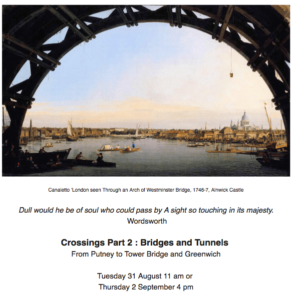 We will travel its currents inspired by its poetry and prose, gliding beneath and past its bridges and auxiliary buildings – each worthy of praise as feats of architecture and engineering. We will see wondrous works by artists who employed the full range of their talents to represent its daily and seasonal light, atmospheric mists, and its bustling activity: Turner, Constable, Canaletto, Scott, Whistler, Grimshaw, Monet and Pissarro. We will hear the words of the classic wordsmiths, Geoffrey Chaucer, Edmund Spenser, William Wordsworth, Lewis Carroll, Charles Dickens, William Morris, Kenneth Grahame, Jerome K Jerome, and more modern voices who eloquently expressed its power. Classical composers Elgar, Handel, Butterworth, Vaughan Williams and John Ireland composed brilliant music reflecting its constant yet volatile nature. Ten thousand Thames watermen sang of its vitality in a flood of folk songs. Nowhere do these creative figures expend their skills on a more alluring or more difficult subject than on the turbulent Thames.