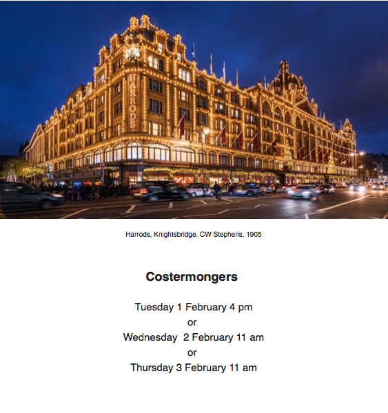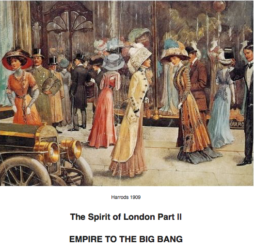 This is the London whose distinct spirit was marked by market traders shouting in the streets, smartly-dressed ladies milling about the fragrant aisles of opulent department stores, impeccably-dressed visitors taking tea in Palm Courts, raucous beer drinkers laughing in mirrored bars, excited crowds packing hot theatres, brightly-lit shops lighting up winter evenings, umbrella-carrying commuters rushing through smoke to trains, grandiose architecture saluting London as the Hub of Empire and self-conscious village-style suburbs offering verdant relief from the hustle and the bustle. It is the London of Elgar’s Cockayne and the Kinks’ Waterloo Sunset, of Knightsbridge and of Carnaby Street, of West End Theatres and East End Music Halls.