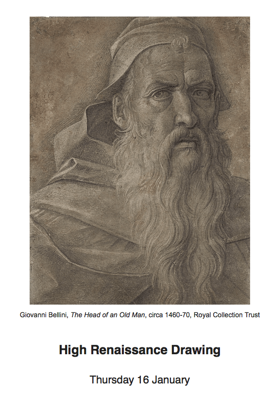 Both London exhibitions include stunning drawings, such as the one above, whose subjects can seem almost to speak to us. For that reason, and because drawings underlie most High Renaissance paintings and sculptures, it is with drawings we begin our course. Their appeal may at first be elusive, but once you have taken time to examine them, there is quite simply no art more rewarding. For here, right in front of you, are the artist’s mind and hand. No intermediaries, no assistants. Just the artist, him or herself, with every mark a thought, a gesture, in the great creative act that somehow conjures three dimensions out of two, sometimes with nothing more elaborate than a piece of chalk or charcoal. In our Zoom sessions, aided by state-of-the-art technology so that we can home in on the tiniest mark, you can actually see minute details hard to make out with the naked eye, let alone when jostling for space with other spectators in an exhibition.