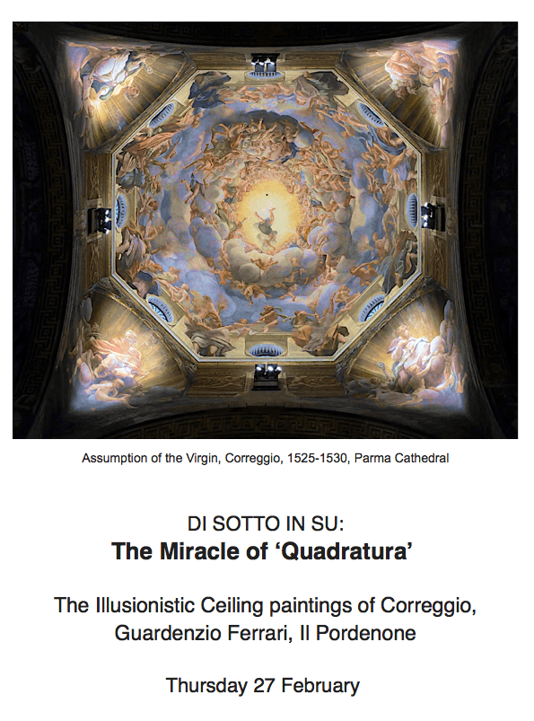 Speaking of heaven, the High Renaissance saw the development of ‘heaven ceilings’ by Correggio and his followers. Such painters took advantage of balance in 16c architecture sometimes being expressed in the form of a dome supported by pendentives at each corner. The pendentives, being four in number, lent themselves to Christian symbolism (four Evangelists, Four Gospels, Four Fathers of the Latin Church), while the vaults, by suggesting the heavens, lent themselves to the subject of the Assumption or an Apotheosis. The eye is drawn upward into soaring layers of clouds and figures, the origin of even more majestic Baroque conceptions of the following century.