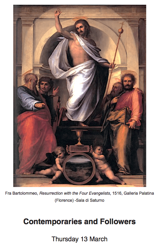 What is High about the High Renaissance? has been developed by Louise Friend and will be presented by Nicholas Friend via video (Zoom). It is held on Thursdays, beginning on Thursday 16 January 2025 at 5 pm and ending on Thursday 20 March 2025 at 5 pm. Please note the time of 5 pm: Nicholas will be lecturing from London or California (for the duration of this course.