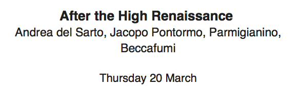 Our course ends with the period 1515-1570, a period that has been famously referred to as ‘Mannerism’. But that is to do it an injustice. ‘Mannered’ suggests something superficial, affected, but such artists as Pontormo and Parmigianino were far more subtle than that label suggests. They reconsidered subject matter, embarking on oddly proportioned figures to enhance a vision, or showing multiple scenes in one frame to illustrate a complex narrative. Their colouring was sometimes deliberately inharmonious or particularly brilliant, designed to catch the spectator off-guard and make them look more closely. Many of their works have been insufficiently studied, something we aim to correct here and now.