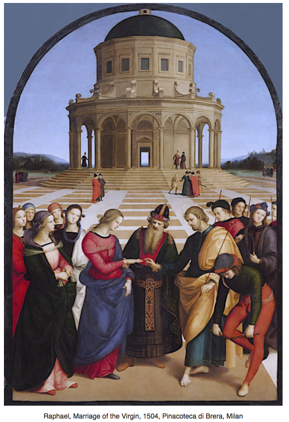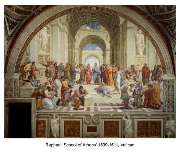 Of all three visual arts, architecture of this period is the one most likely to express balance and symmetry. For religious architecture, balance and proportion inspire confidence. No architect knew this more than Bramante, whose work inspires so much ecclesiastical architecture of later generations, such as Wren’s St Pauls and Hawkmoor’s Mausoleum at Castle Howard. But the beauty of his proportions finds its echo in the painted background architecture in High Renaissance altarpieces and murals, particularly by Raphael and his followers. Indeed, Vasari thought it was Bramante who was responsible for the astonishing architectural grandeur of Raphael’s ‘School of Athens’ in the Vatican (see below).