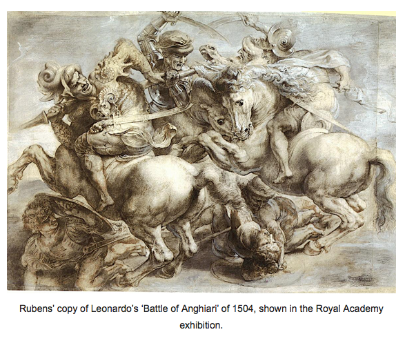 But in the last thirty years, some art historians have criticized the term ‘High Renaissance’ as being an oversimplification. After all, what is symmetrical or harmonious about the grouping or gestures of the disciples in Leonardo’s Last Supper? What is harmonious about the warriors in his Battle of Anghiari as copied by Rubens, see below?
