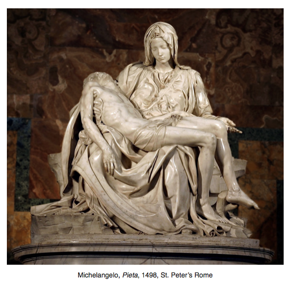 In a similar way, when we look at Michelangelo’s first great masterpiece, the Pietà in Rome, (below) we see boiling draperies, utterly at odds with the serenity of the Virgin’s face. The High Renaissance includes numerous examples of such majestic oppositions in Michelangelo’s sculpture, whether in his ‘slaves’ or his work for Julius II’s tomb, as well as in that of his High Renaissance followers Baccio Bandinelli and Lorenzo Bregno.