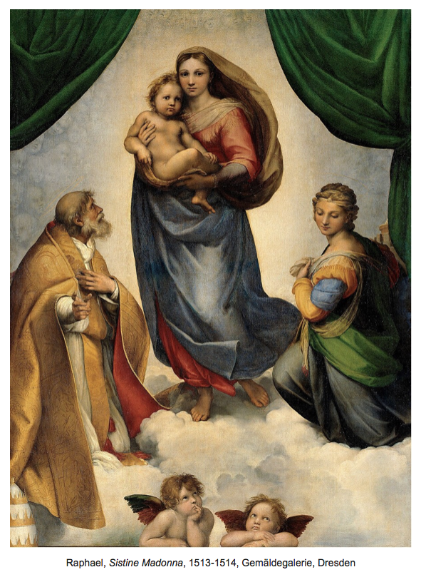 The great Russian 19c novelist Dostoevsky called Raphael’s Sistine Madonna “the greatest revelation of the human spirit”. Dostoevsky was not the first to remark on the power of the work. Only thirty years after Raphael’s death, Vasari wrote that it was “a truly rare and extraordinary work.” The neoclassical 18c theorist Johann Winckelmann was fascinated by it. It had a great influence on the German writer and scholar Goethe, the musician Wagner, and the philosopher Nietzsche. It and other works by Raphael also influenced modern artists like Pablo Picasso, who said, “Leonardo da Vinci promises us heaven. Raphael gives it to us.” The image of the cherubim alone has had an extensive popular culture presence, being featured on contemporary postcards, U.S. stamps, T-shirts, and other consumer items.
