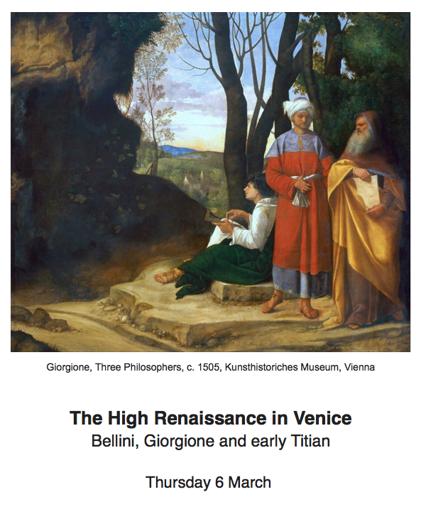 We discover that indeed to be a painter in Venice WAS a very different matter from being a painter in Florence or Rome. If you belonged to the painters’ guild in Venice, then painting was what you did, but in Florence or Rome you might be expected to turn your hand to sculpture or architecture as well, as indeed did Leonardo, Raphael and Michelangelo, all three. But there was something more to Venetian painting. In the early 16c painters such as Giovanni Bellini, Giorgione and Titian came up with more than their fair share of mystery paintings, like the one above, whose meanings are still being debated to this day, while spectators revel in the glories of their light, their vibrant colour and the softness of their brushstrokes.