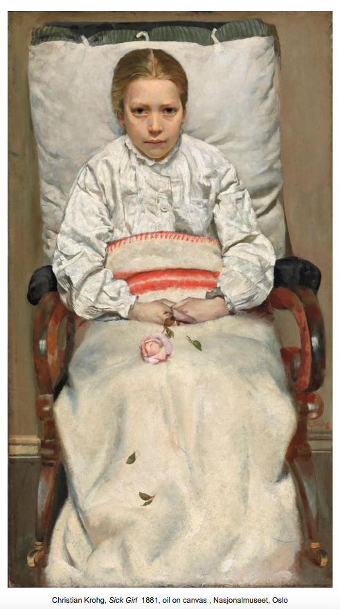 Gradually, very gradually, the work of Christian Krohg (1852-1925) has been emerging out of the shadow cast by his teacher, Edvard Munch. But now, bang! He has a major exhibition at the Musée D’Orsay in Paris where, rightfully so, the Norwegian Krohg belongs with the best, the most inventive, French art of the late 19c. In paintings of superlative skill Krohg can give us even more of an insight into late 19c Norwegian social concerns. He dives into the essence of his subject, whether a fragile convalescent girl, a group of prostitutes waiting to be examined in a police clinic, or a courageous fisherman in a rough sea, presenting his subjects up close like a modern film cameraman. Yet what might have been a grim inventory is elevated by dynamic postures, unbalanced compositions, and glorious colour, each hue in counterpoint with its neighbour. Christian Krohg was a profoundly humanist, libertarian and feminist painter. Through his works, the artist sought to raise awareness of critical political, moral and social issues, especially the status of women, the hard life of a Norwegian fishermen braving the rough seas of the North Atlantic, and the cruel, exhausting poverty that is the 19c seamstress’s lot.