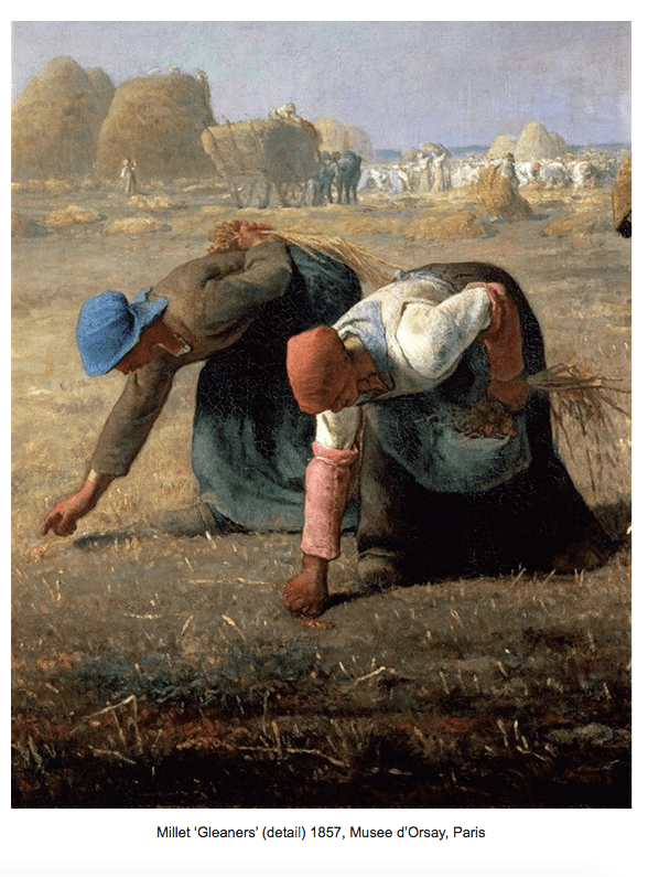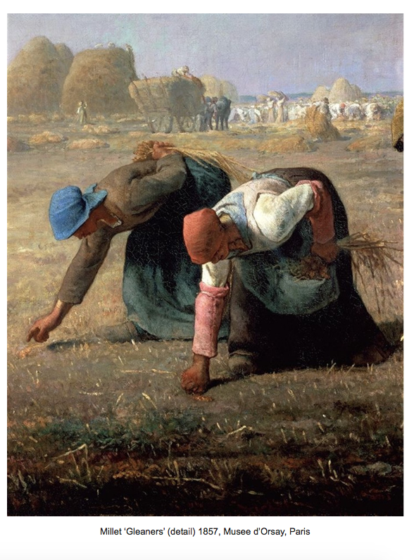 Jean-Francois Millet makes of the most ordinary scenes in the countryside-wheeling a barrow, planting potatoes, saying the angelus in an open field- something not only heroic and suitable for the walls of the Paris salon, but something which can satisfy the eye of a connoisseur of Greco-Roman statuary. He does this, as did great ancient Greek masters of athletic statuary, by drawing our attention to gesture, to physical effort, even if that means depicting the winnowing of grain rather than launching a discus. Our focus is on the wrinkles of a toil-beaten wrist, the forward lurch of the body wheeling a barrow out of a farmyard, or the swinging motion of a sower on a Norman field. Was Millet a political revolutionary? Certainly the tricolor of red white and blue appear often enough in his paintings, and there is little wonder that his name is linked with that of Courbet as one of the fathers of French Realism which led eventually to Impressionism and much later the kitchen sink school. But social revolution is not as important for him as artistic revolution: helping us see the heroic and the instructive in the ordinary.